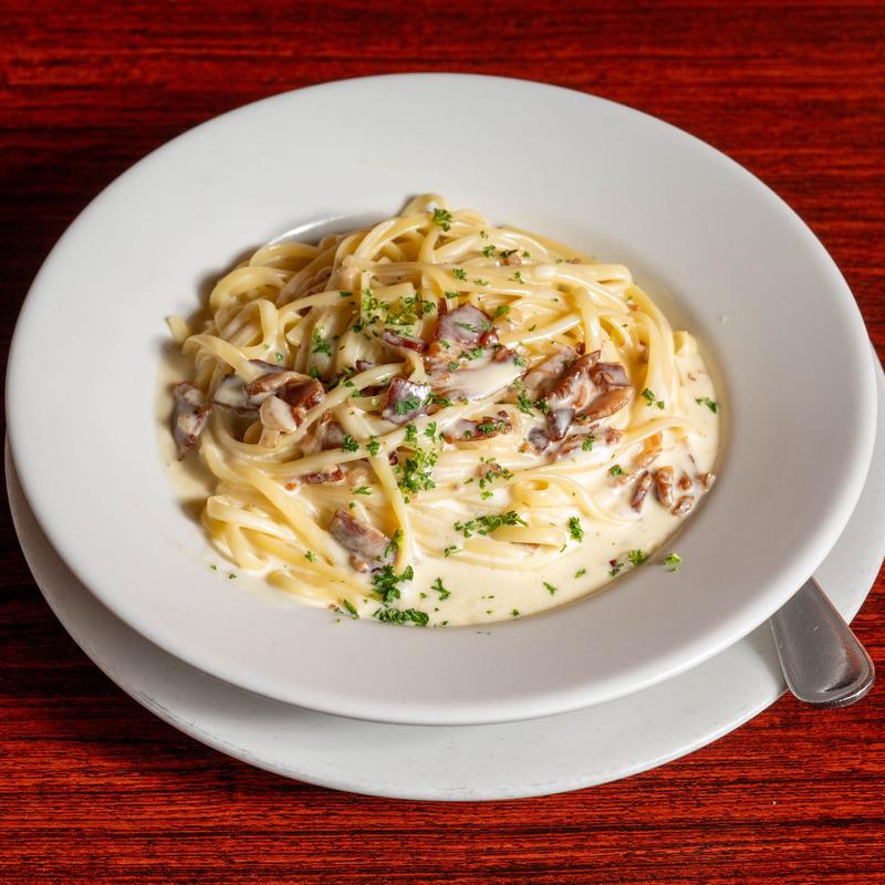 Linguine pasta, crispy bacon, parsley, cream sauce, egg yolk, and Parmesan cheese.