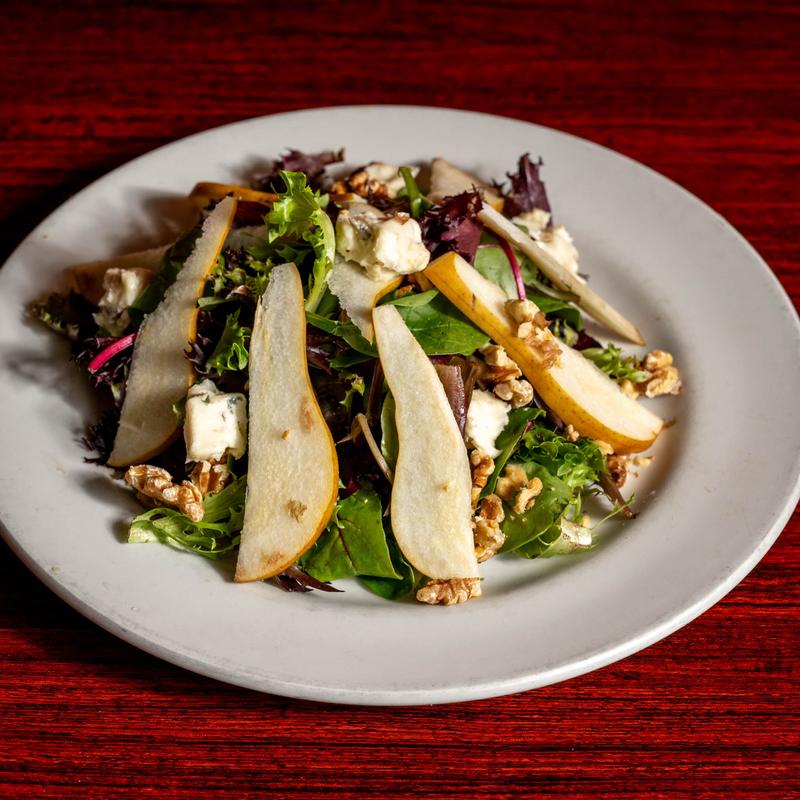Mixed greens salad, pears, roasted walnuts, Gorgonzola cheese, and balsamic vinaigrette.