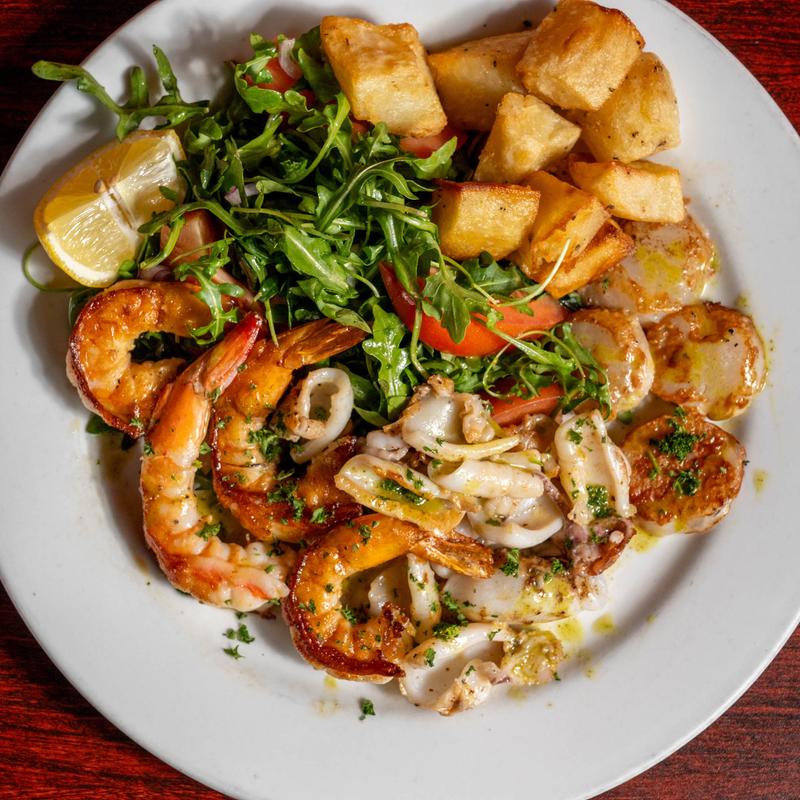 Grilled scallops, prawns, calamari, parsley, lemon sauce, roasted potatoes, and arugula salad.
