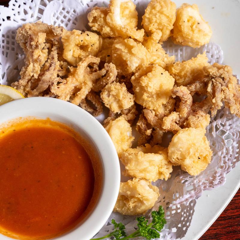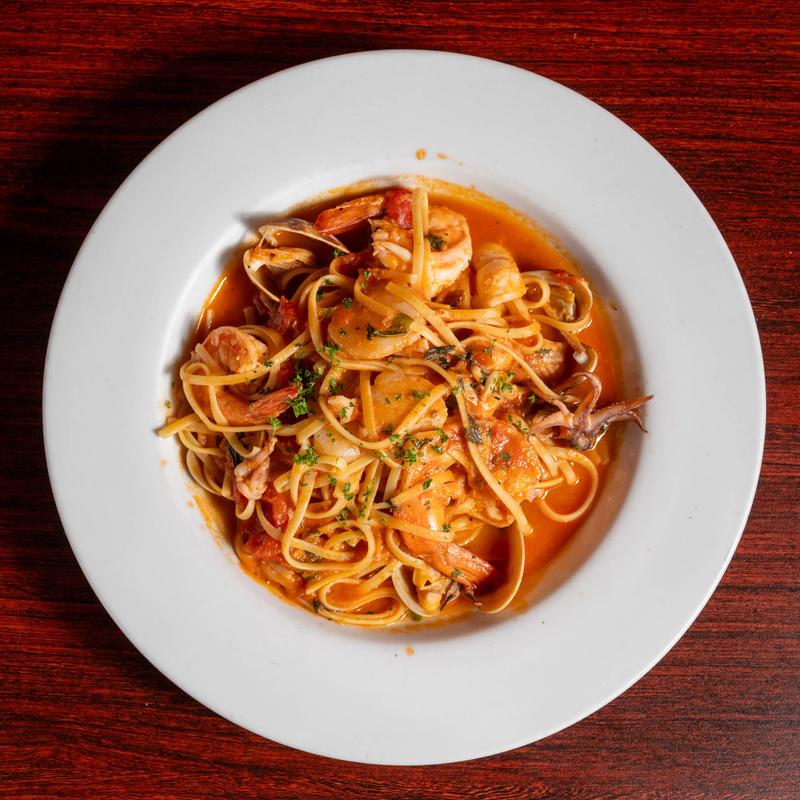 Thin flat pasta with clams, squid, prawns, scallops, and fish, seasoned with tomatoes, crushed red pepper, garlic, and white wine.