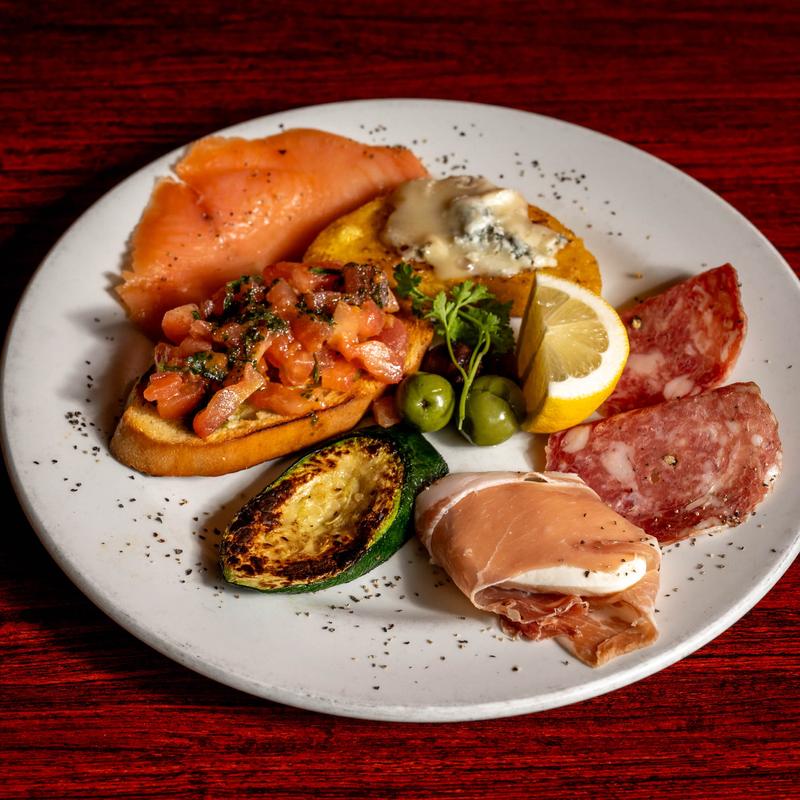 A sampling of authentic Italian antipasti including bruschetta, grilled zucchini, fresh mozzarella wrapped with prosciutto, olives, salami, grilled polenta, gorgonzola, and smoked salmon.