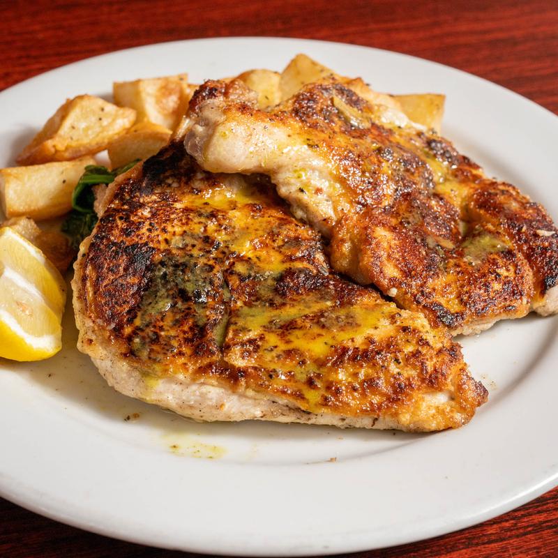 1/2 chicken grilled under a brick, marinated with fresh herbs, lemon, garlic, and olive oil. Served with roasted potatoes and spinach.