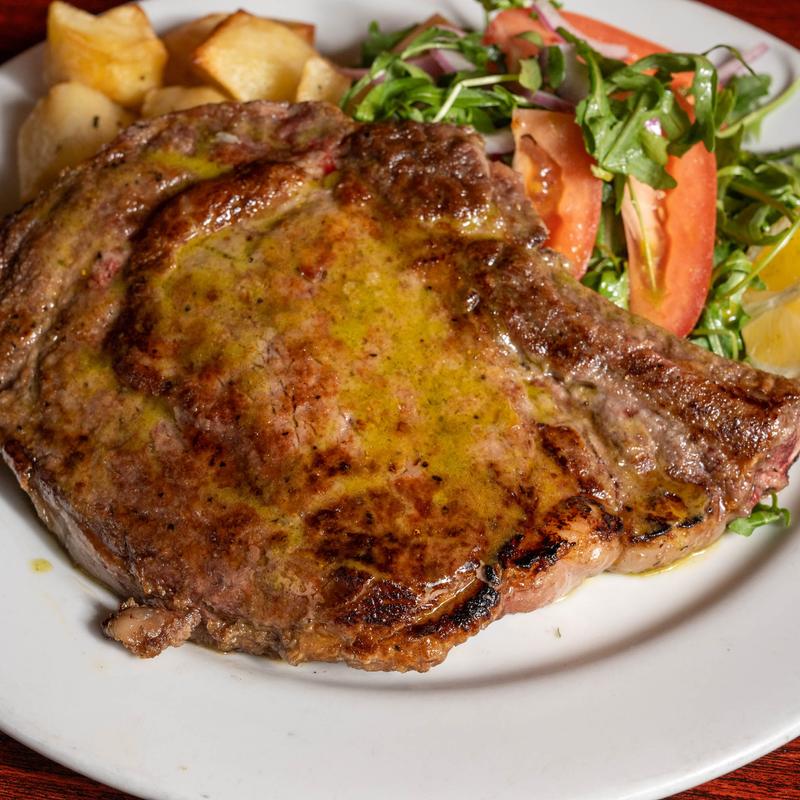 Grilled bone-in rib eye steak, drizzled with lemon olive oil vinaigrette. Served with roasted potatoes and arugula salad.