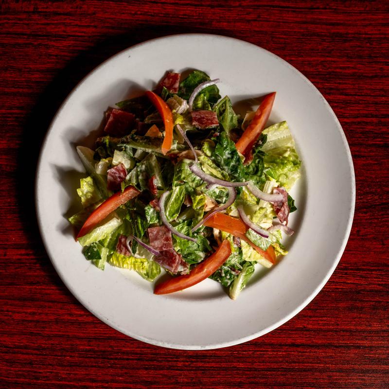 Hearts of romaine lettuce, red onions, button mushrooms, salami, Parmesan cheese, and homemade dressing.