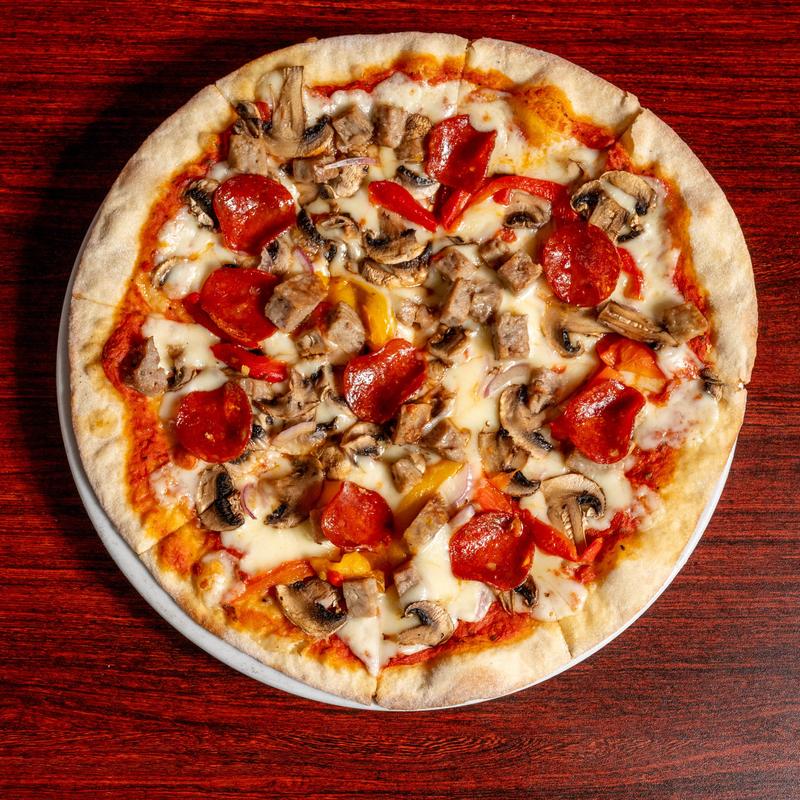 Italian sausage, mushrooms, bell pepper, red onions, mozzarella, tomato sauce, and pepperoni.
